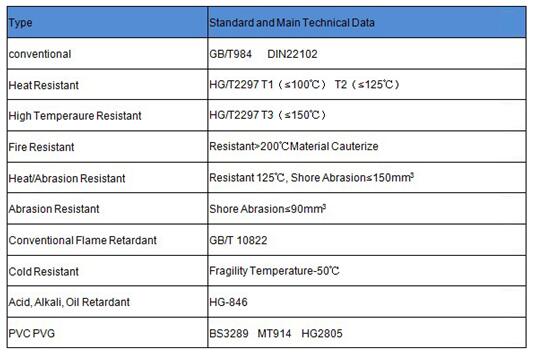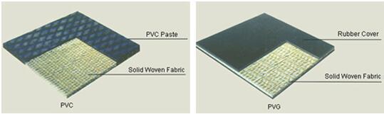 Belt Construction: For PVC belt, top rubber and bottom rubber are PVC coating cover, single-sided cover rubber thickness not less than 1.0mm; For PVG belt, top rubber and bottom rubber are nitrile rubber and PVC, single-sided cover rubber thickness: 1.5mm-4.5mm.